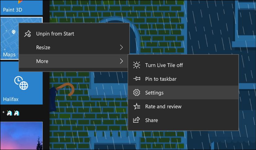 In this flight, the Start menu gets updated and adds new options to access settings from Microsoft Store apps. Simply right-click a tile, select More, and click Settings to access the app’s settings page with option to repair, manage app add-ons, and see startup tasks (if available).
