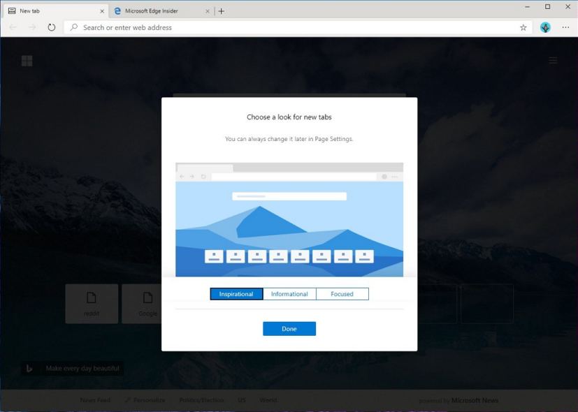 After downloading and installing the Chromium version of Microsoft Edge, you’ll need to go through the setup process that allows you to quickly import your bookmarks, history, and passwords from your current default browser (such as Edge, Chrome, or Firefox). In addition, you’ll be prompted to enable sync, and you will need to choose the default style for your default tab (inspirational, informational, or focused).