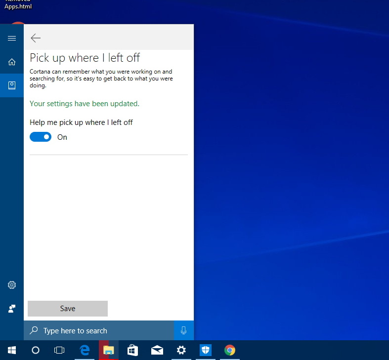 Cortana’s new feature is enabled by default, but you can always check by going to Cortana > Notebook > Pick up where I left off, and see that the Help me pick up where I left off toggle switch is turned on.